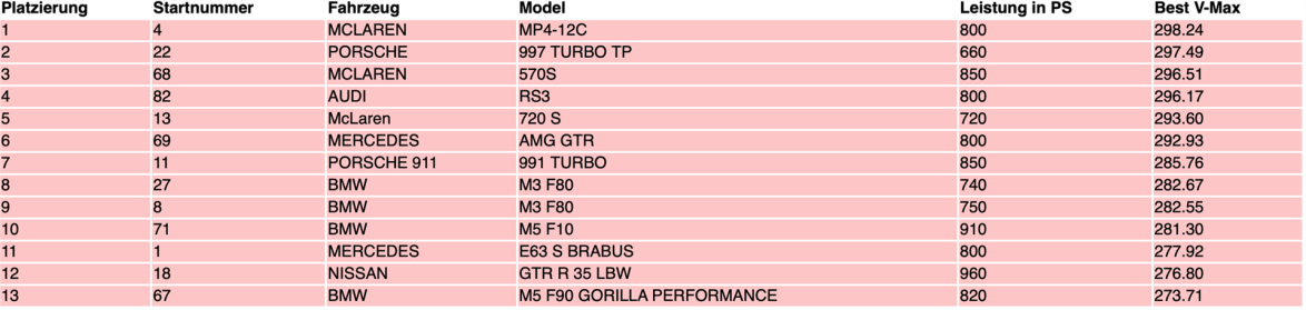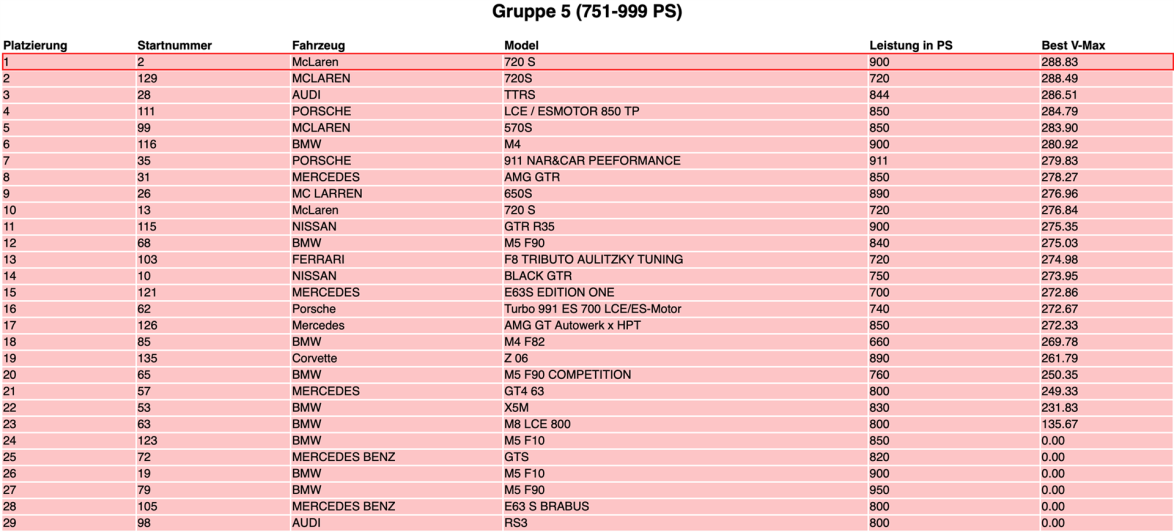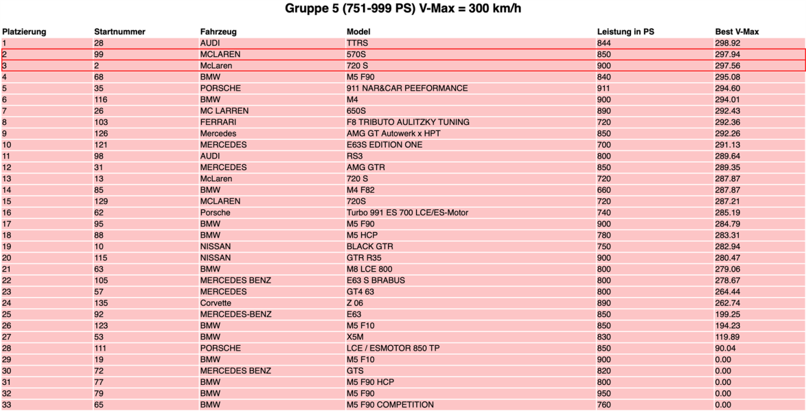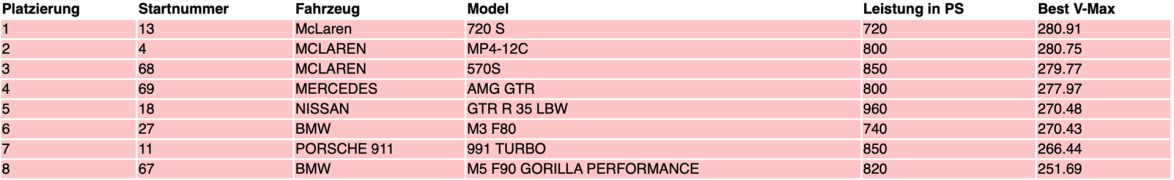 In der Disziplin Rolling50 1000 der Gruppe 5 (751-999 PS, V-Max = 300 km/h, insgesamt 31 Teilnehmerfahrzeuge), konnten wir in unserem McLaren 570s P4M (850 PS) mit 297,94 km/h den #2 Platz ergattern. Im Vergleich zum vorigen Event im August mit 296,51 km/h und dem damaligen #3 Platz, entspricht dies nochmals einer Steigerung von ganzen 1,43 km/h bei erschwerten Fahrbedingungen!